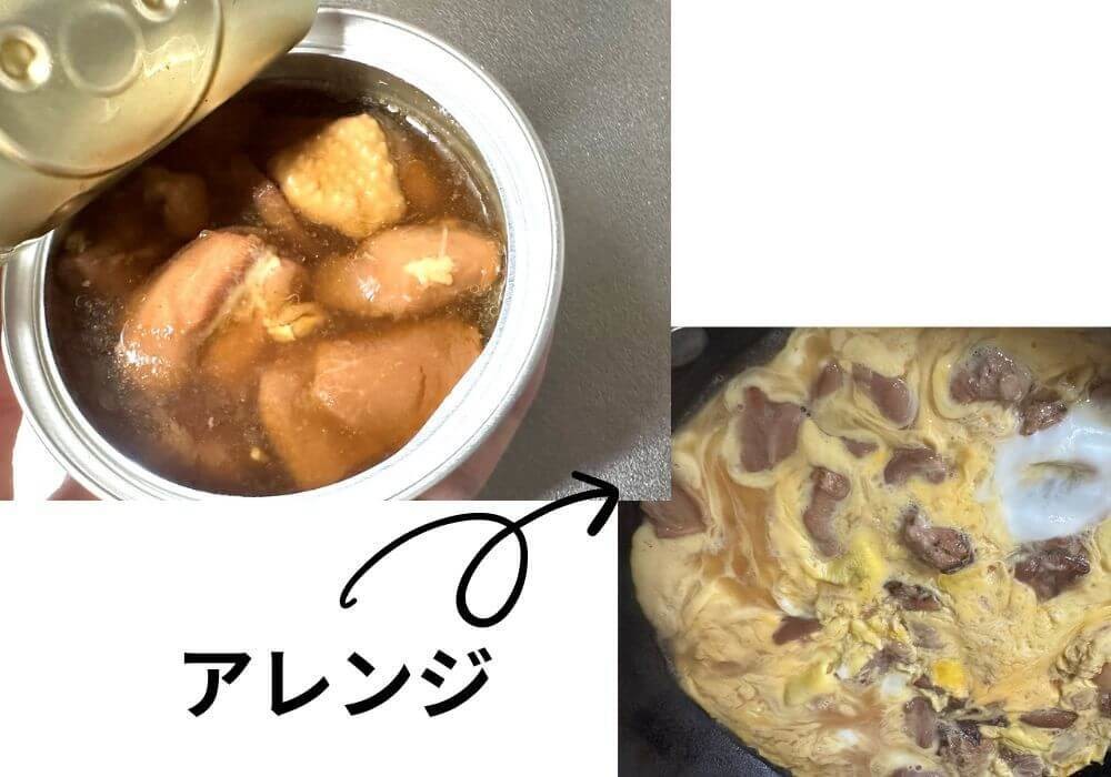 缶詰はそのまま食べてもおいしいですが、お肉を買い忘れたときに我が家ではアレンジレシピに使います。 鶏肉のうま煮は卵とじにして親子丼に変身♪