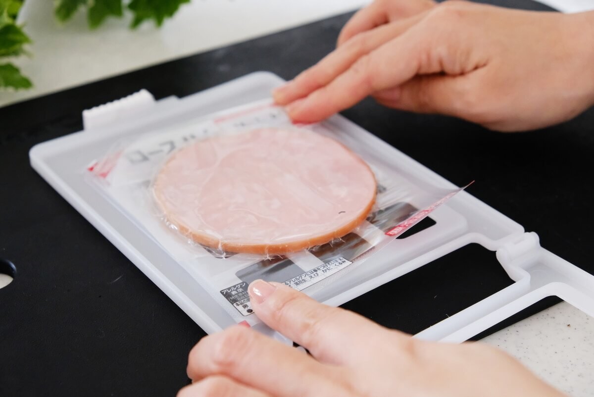 ケースを開いたら、ハムやベーコンのパッケージを乗せます。