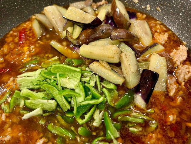 なすを油で事前に火を通しているので、かなり色鮮やか。ピーマンも入っているので、彩りがキレイなマーボーなすになっています。