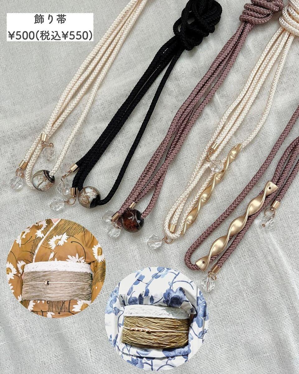 写真右上の「くしゅくしゅ兵児帯(1,320円)」は、アイボリー・カーキ・その他の3色展開。くしゅくしゅしたデザインがボリューム感あり!簡単な結び方でもおしゃれな印象を与えられます。