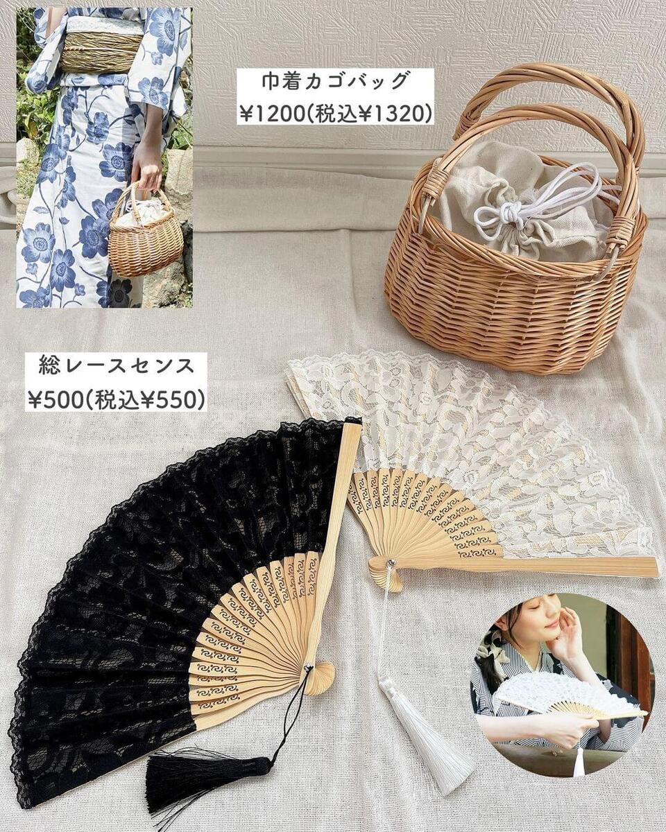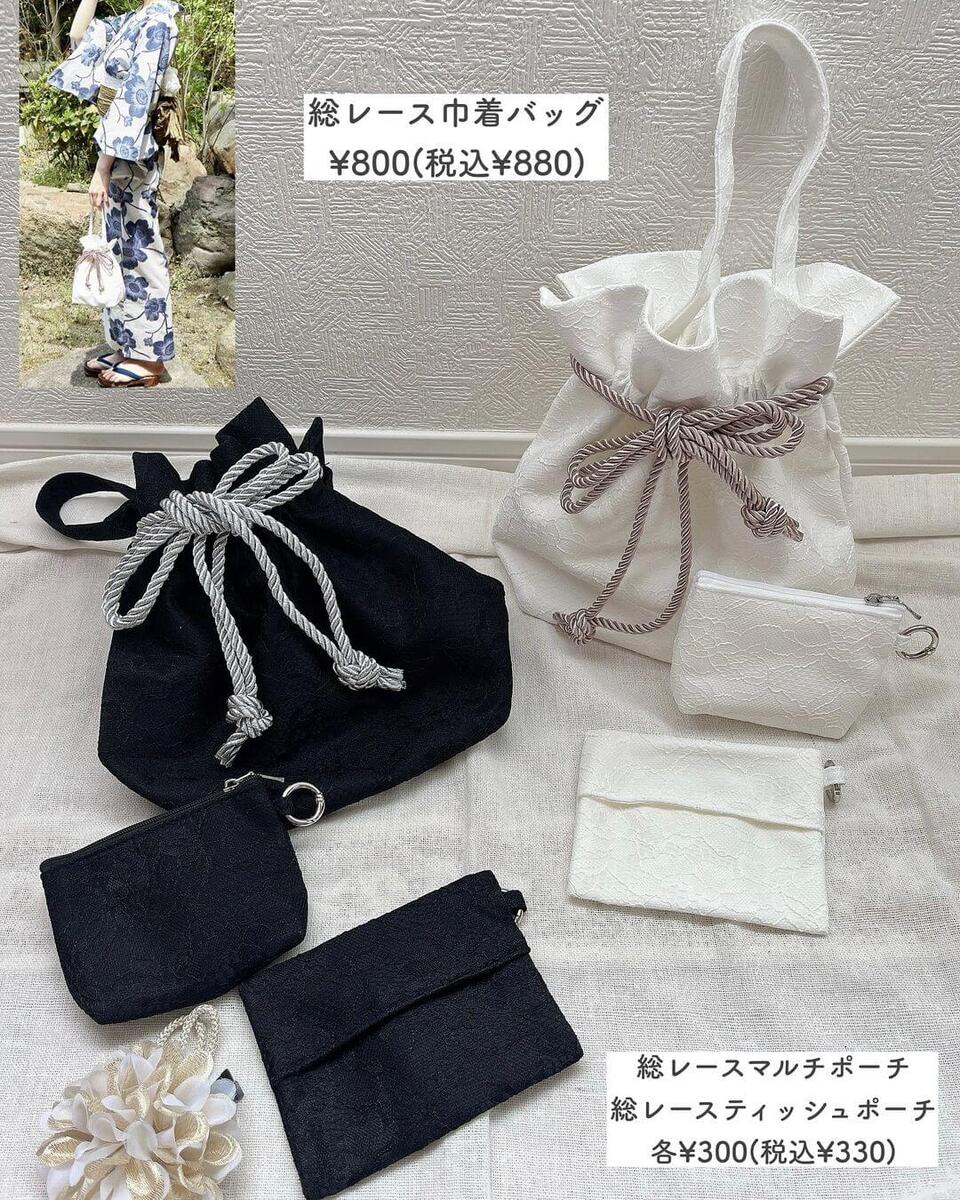 写真上の「総レース巾着バッグ(880円)」、可愛すぎませんか!?総レースが涼しげで浴衣にぴったり。マチ付きでたっぷり入るのも魅力です。