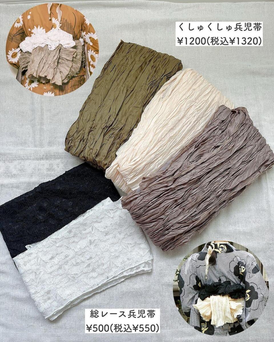 写真左下の「総レース兵児帯(550円)」はホワイトとブラックの2色展開。くしゅくしゅ兵児帯と合わせるのがおすすめ!総レースが大人っぽく上品に仕上げてくれますよ。