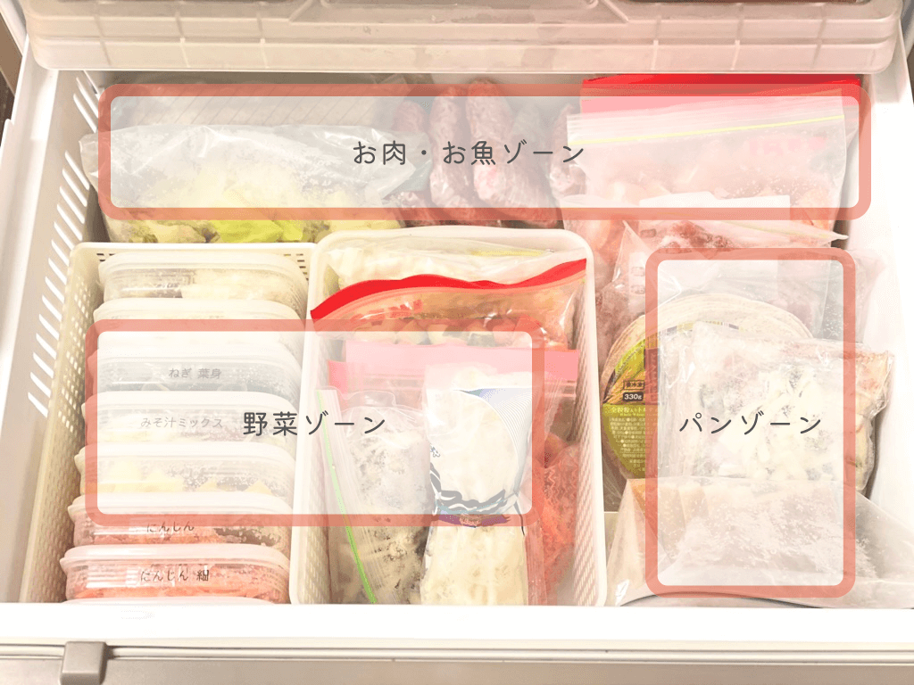 これは実際のわが家の冷凍庫。【お肉・お魚ゾーン】【野菜ゾーン】【パンゾーン】のように、ざっくりと分けておくと、探す手間が全くかからなくなります。