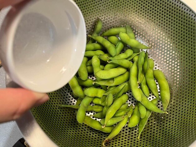 湯切りした枝豆をボウルに入れ、塩と味の素をかけます。