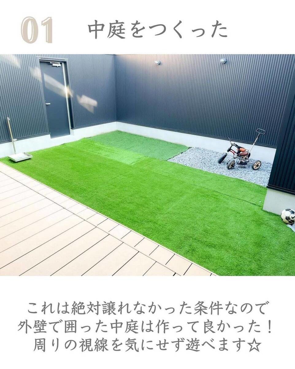 外壁で囲まれているプライベートな中庭があると、周りの視線を気にせずに遊べるんだとか。