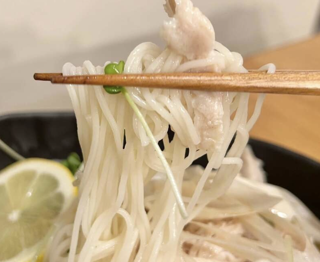 サラダチキン、貝割れ菜、ねぎ、薄切りにしたレモンをのせて、冷やしておいたつゆを注ぎます。