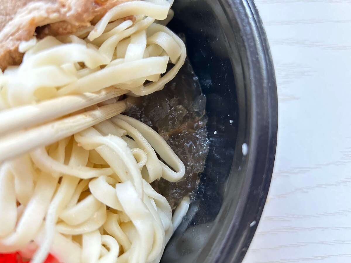 スープはこのようにジュレ状になっていて、麺の下に入っています。スープの袋を開ける手間がなく、そのままレンジ加熱できます。スープ袋を開けたあとのゴミの扱いはちょっぴり面倒なので無いのはうれしいですね!