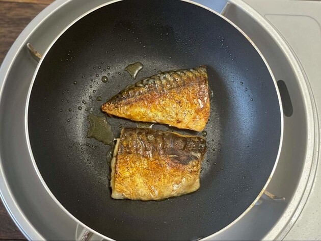 そうそう。塩サバの皮目を焼いて、裏返す前に火を止めたのですが……。