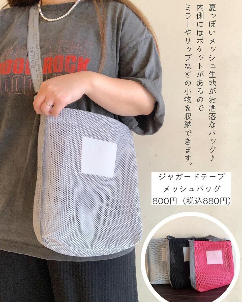 夏らしいメッシュ生地の「ジャガードテープメッシュバッグ(880円)」は、おでかけやレジャーで大活躍間違いなし◎ピンク・ブラック・ライトグレーの3種類あり、全部揃えたくなってしまいます!