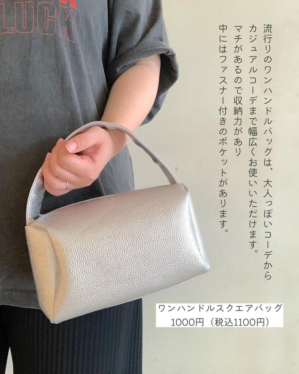 大人っぽいコーデからカジュアルコーデまで幅広く使える「ワンハンドルスクエアバッグ(1,100円)」。カラーは、シルバー・ホワイト・ブラック・ライトブルーの4種類あります。