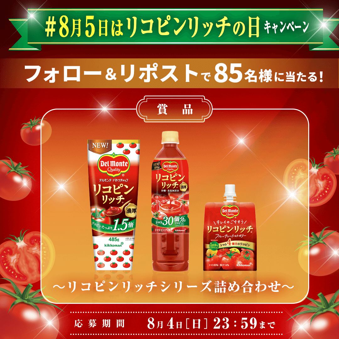 8月5日の「リコピンリッチの日」にちなんで、85名様に「デルモンテ リコピンリッチ」シリーズ商品の詰め合わせが当たるXキャンペーンを実施します。応募は、デルモンテ公式Xアカウントをフォローして対象ポストをリポストするだけで完了します。皆さま奮ってご応募ください。