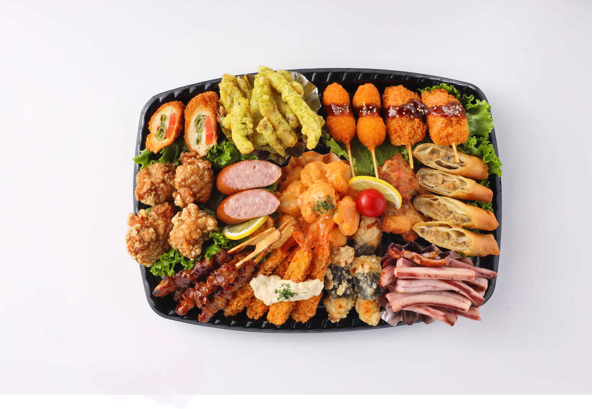 海老マヨソース、イカの磯辺天ぷら、ささみロールカツ(いんげん・人参・チー ズ)、鶏のから揚げ、ポークフランク、炭火焼鳥もも串、海老フライ、若鶏の梅し そ竜田揚げ、イカソフト焼き、10品目の具材入り春巻き、炙り焼き手羽元、豚肉と玉ねぎの串カツ、うずら串フライ