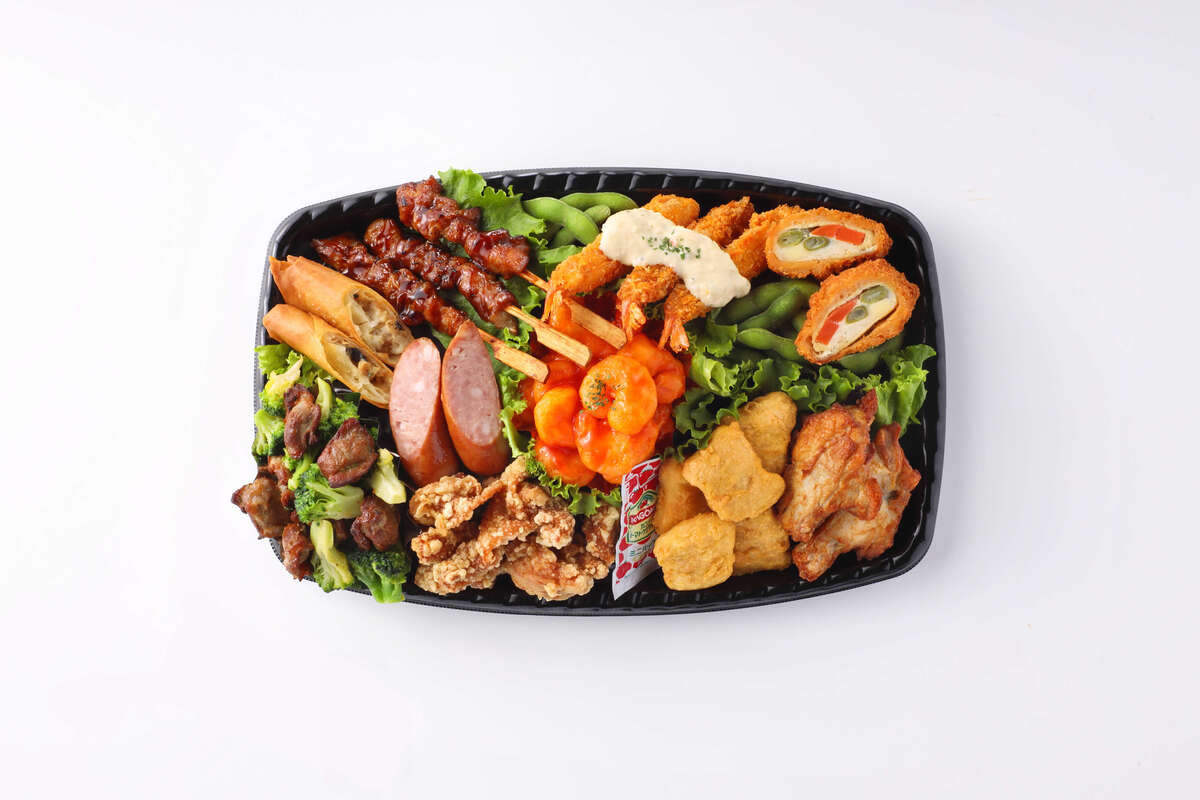海老チリソース、炭火焼鳥もも串、10品目の具材入り春巻き、砂肝とブロッコ リーの塩だれ和え、ポークフランク、鶏のから揚げ、チキンナゲット、炙り焼き手羽元、ささみロールカツ(いんげん・人参・チーズ)、海老フライ、塩あじえだまめ
