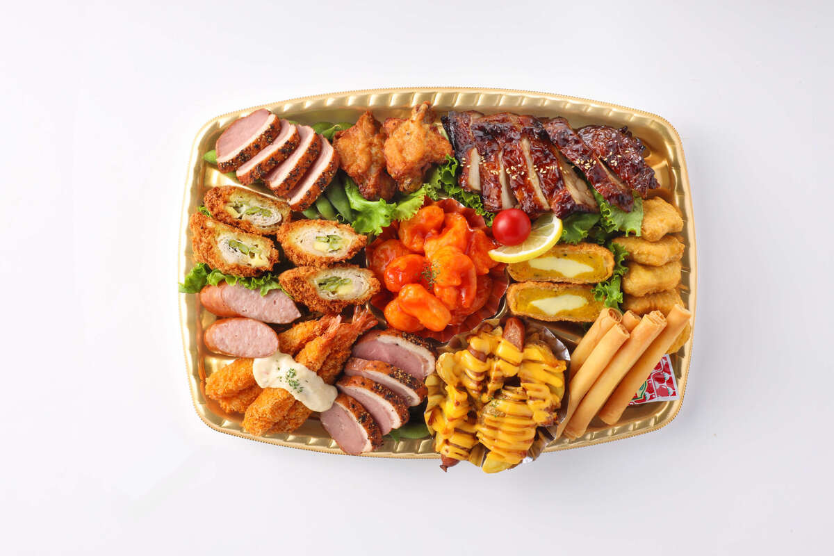 海老チリソース、ウインナーとポテトのチーズ焼き、チーズロール、チキンナゲット、栗かぼちゃとチーズソースの包み揚げ、照り焼きチキンステーキ、炙り焼き手羽元、あい鴨パストラミ、豚のアスパラチーズ巻フライ、ポークフランク、海老フライ、塩あじえだまめ