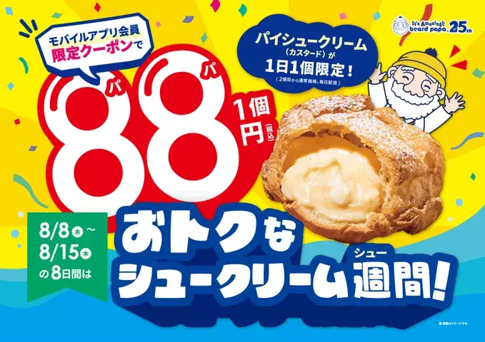今年で25周年を迎えたビアードパパでは、2024年8月8日(木)~8月15日(木)の8日間、「おトクなシュークリーム週間!」を開催中!