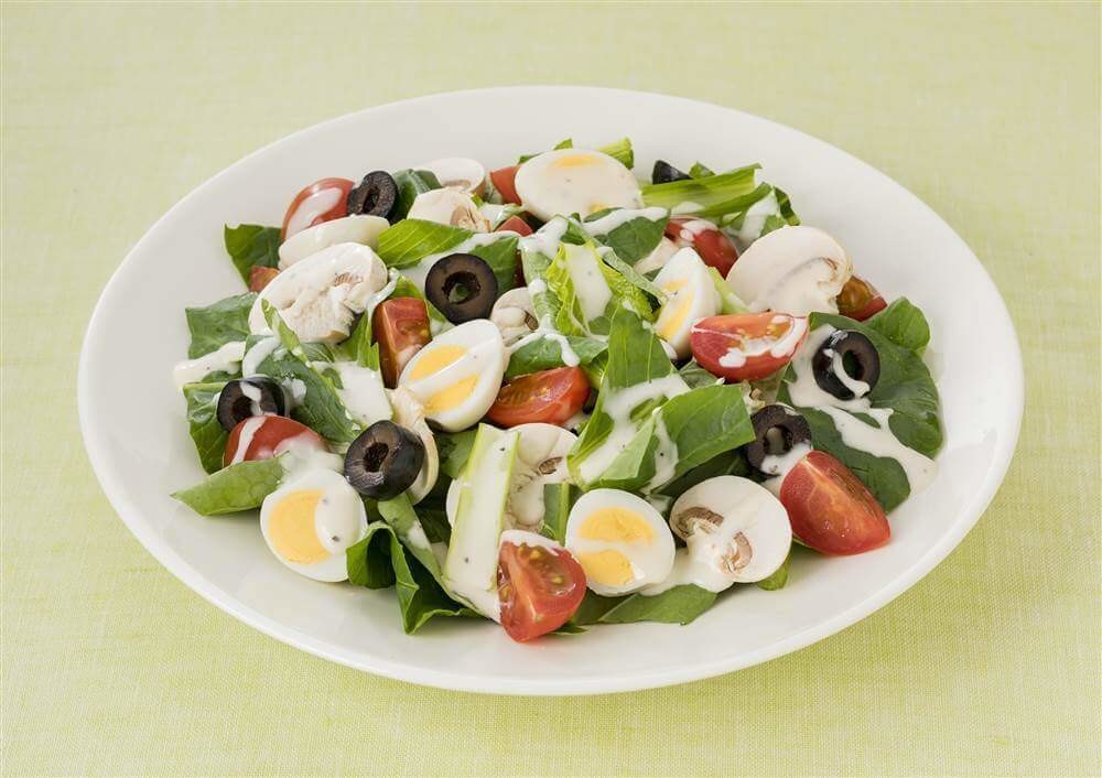 ②器に①を盛りつけ、ブラックオリーブを散らし、ドレッシングをかける。