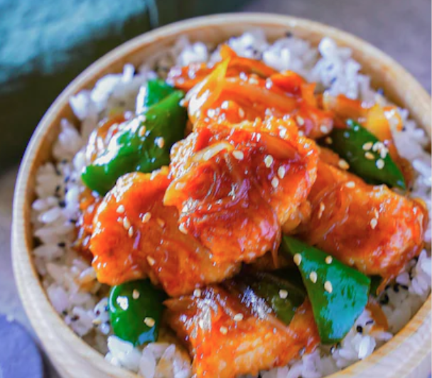 こってりめの甘辛だれが鶏肉の衣に絡みます。野菜はお好きなものを入れてOK。