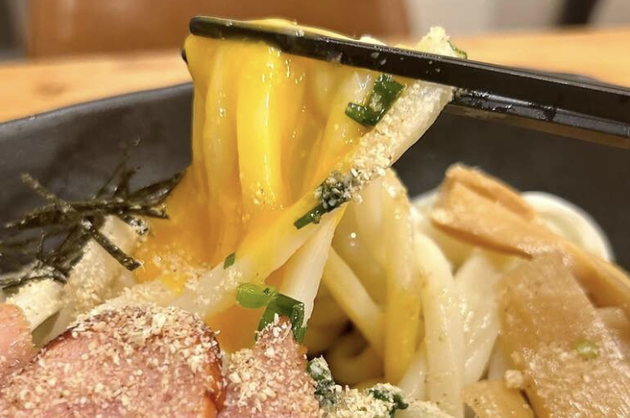 トッピングした卵黄がうどんに絡みあい、濃厚な味わいを楽しめるところも魅力!