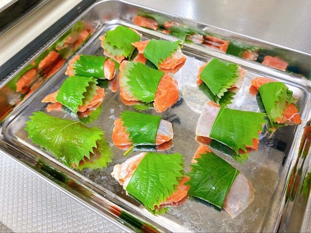 私が購入したものは既定量より小ぶり(3切れで200g)だったので4等分に。鮭が大きいと、あとで青じそが巻きにくいので一口サイズが目安です。