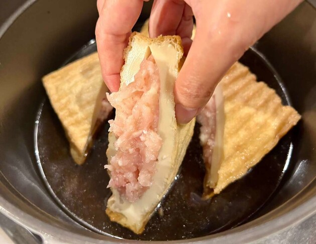 袋状にした厚揚げの中にスプーンで肉ダネを奥まで詰めていきましょう!