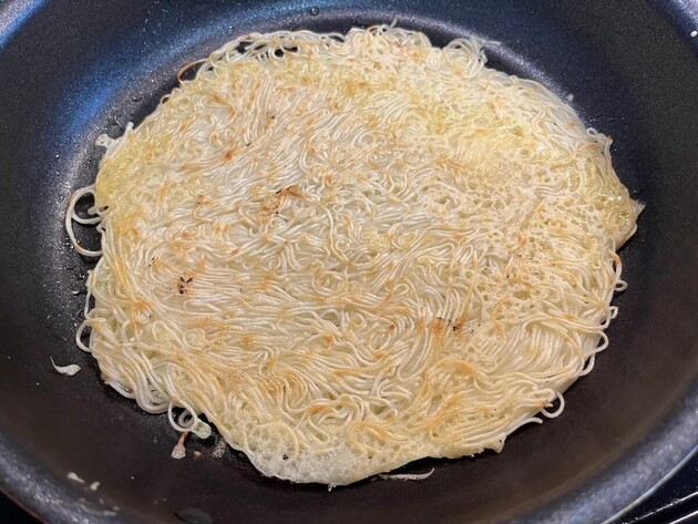 フライパンにオリーブ油大さじ1を熱し、茹でたそうめんを広げてへらで押しつけ、できるだけ薄い円形に広げます。