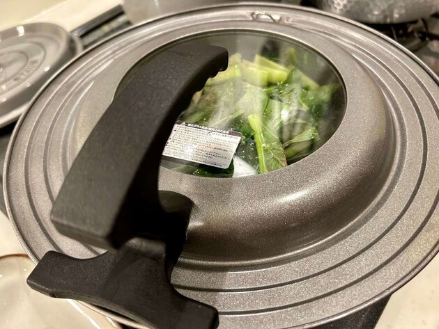 ずっと弱火で蒸してしまうと小松菜の食感が悪くなるので、必ず中火で蒸すのがポイントだそうです。
