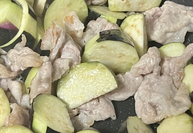 なすにサラダ油・豚こま切れ肉から出た脂をコーティングするイメージで炒めました。