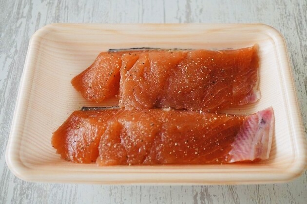 しばらくおいて、さけの水けをキッチンペーパーでふき取ります。