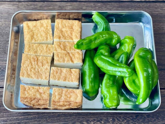 厚揚げを一口大に切り、ししとうのへたも切って除いておきましょう。