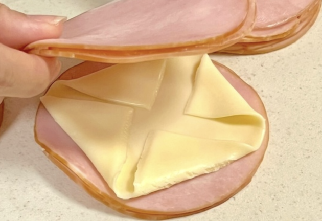 作り方①ハムを3枚重ねてチーズをのせ、さらにハムを3枚重ねる