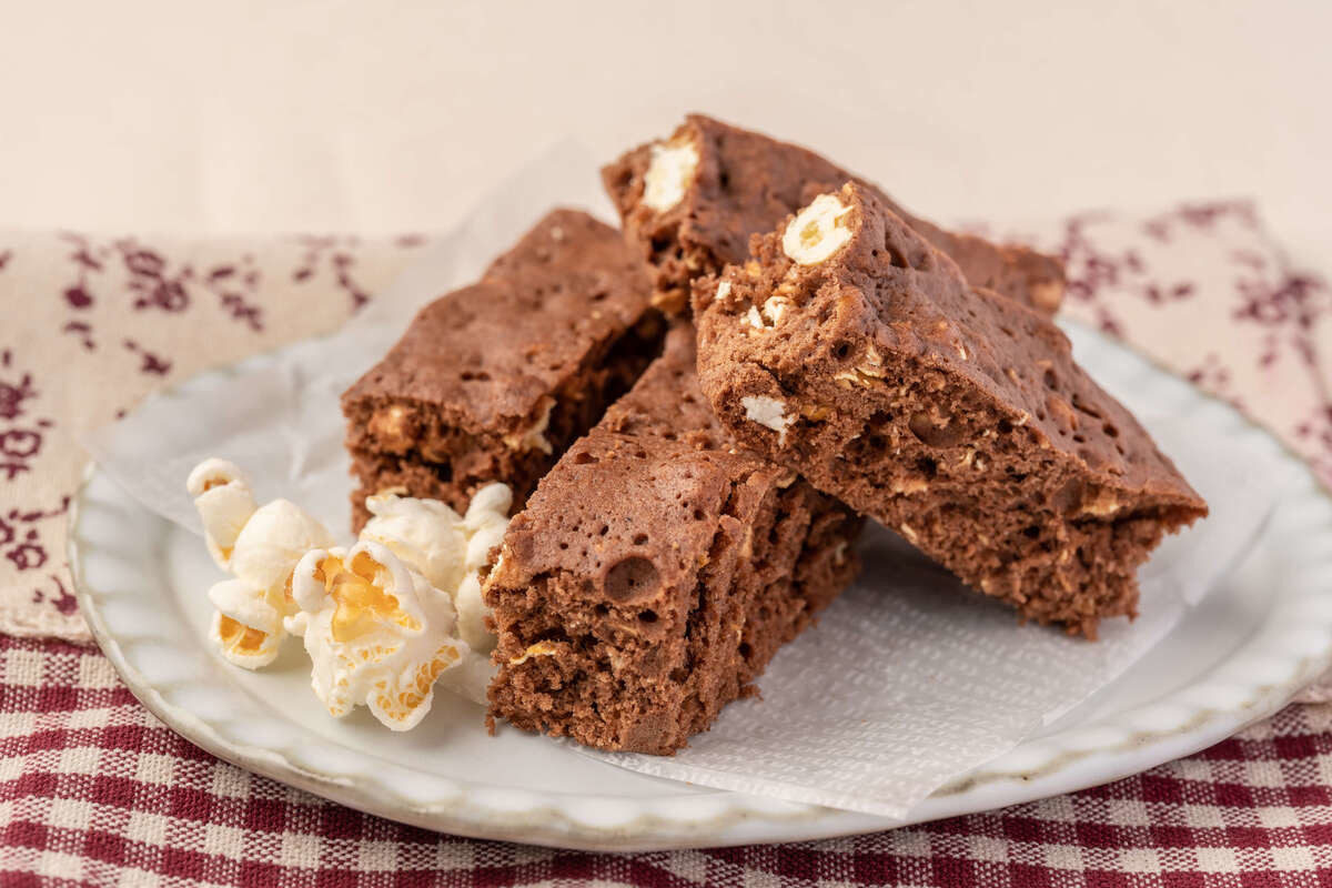 電子レンジで簡単に作れる「ポップコーンチョコブラウニー」。ポップコーンがアクセントになった、斬新でかわいいおやつです。