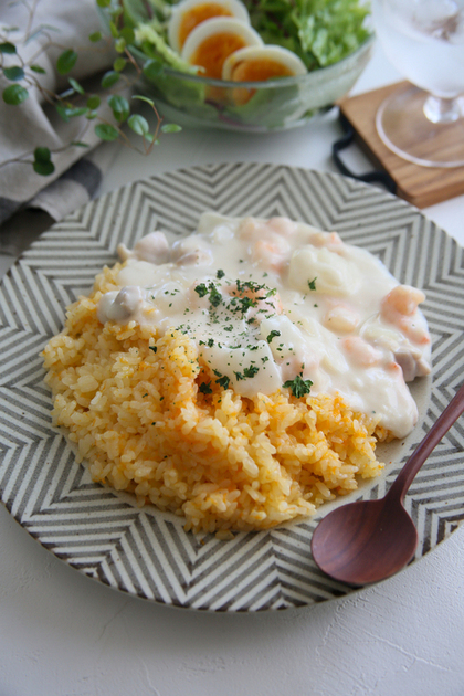 海老チキクリームに限らず、ハヤシライスやカレーの日のごはんをにんじんごはんに変更してみるのもOK!「野菜たべてくれた〜!」って母はすごい達成感。