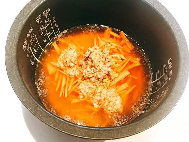 作り方③ツナ、にんじんを入れて炊飯する