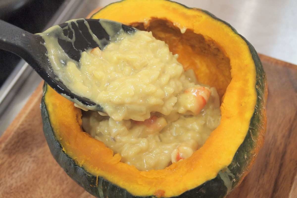 かぼちゃの内側をスプーンで削りながら、リゾットと一緒にいただきます。