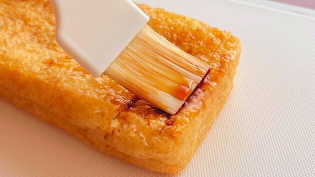 タレ(まずは2/3くらいの量)を油揚げに塗り広げ……