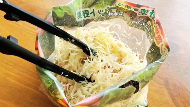 さらに、千切りキャベツの「袋」を調理に活用することで、ボウルや別容器などを使用せずに作ることができるため、洗い物を減らすことにつながります。