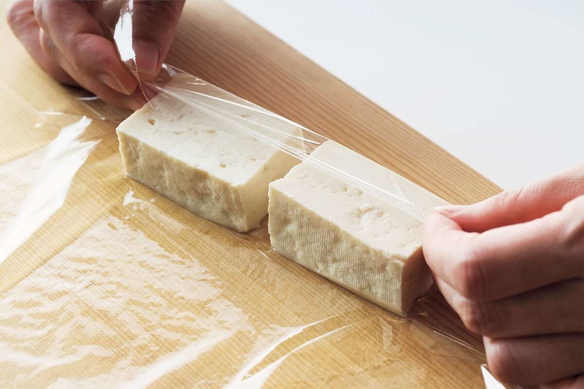 豆腐をラップするひと手間で、パサつきを防げるので美味しく仕上がります!