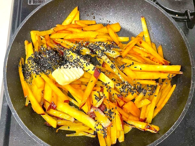 残りのバターを加え、黒ごまを全体にふり、まぶします。