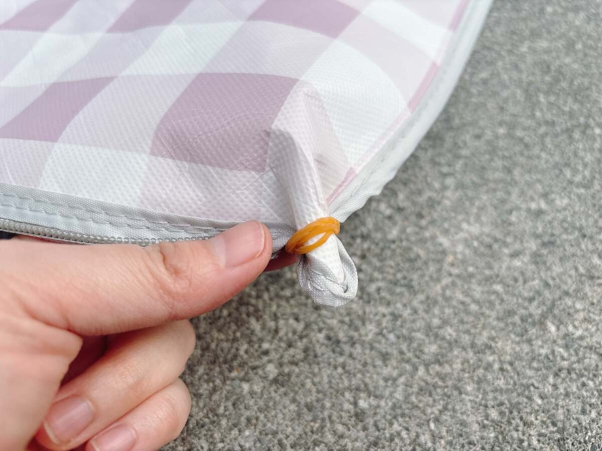 手順1.レジャーシートの四隅を輪ゴムで結ぶ