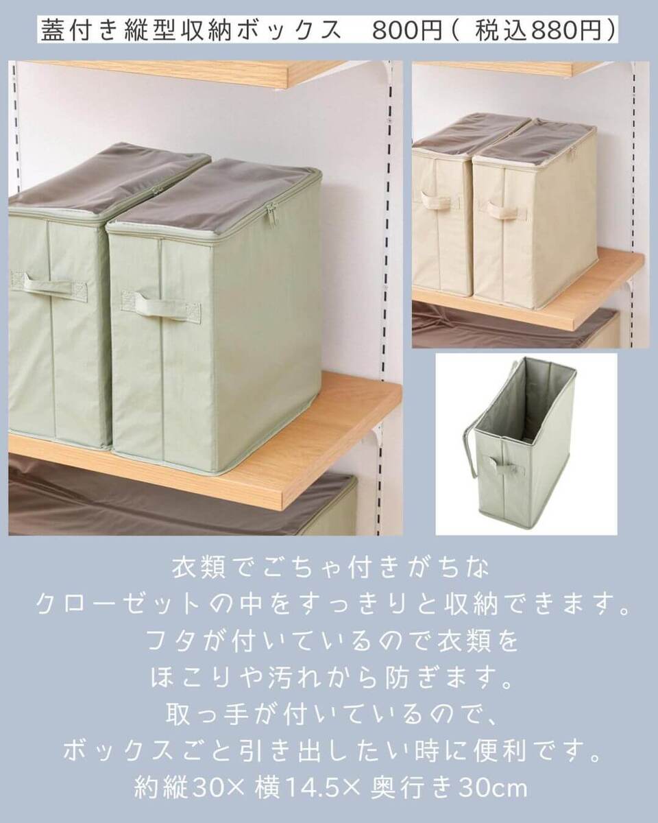 縦型が何かと便利な「蓋付き縦型収納ボックス(¥880)」も、横型と一緒で蓋部分が半透明、取っ手付きと使い勝手抜群!