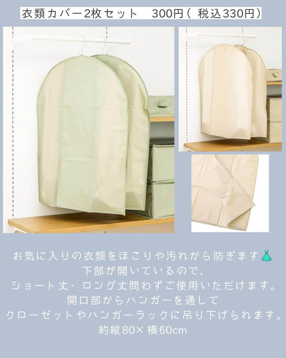 お気に入りの衣類をほこりや汚れから防げる「衣類カバー2枚セット」は、2枚でなんと¥330!下部が開いているので、ショート丈・ロング丈問わず使えます。