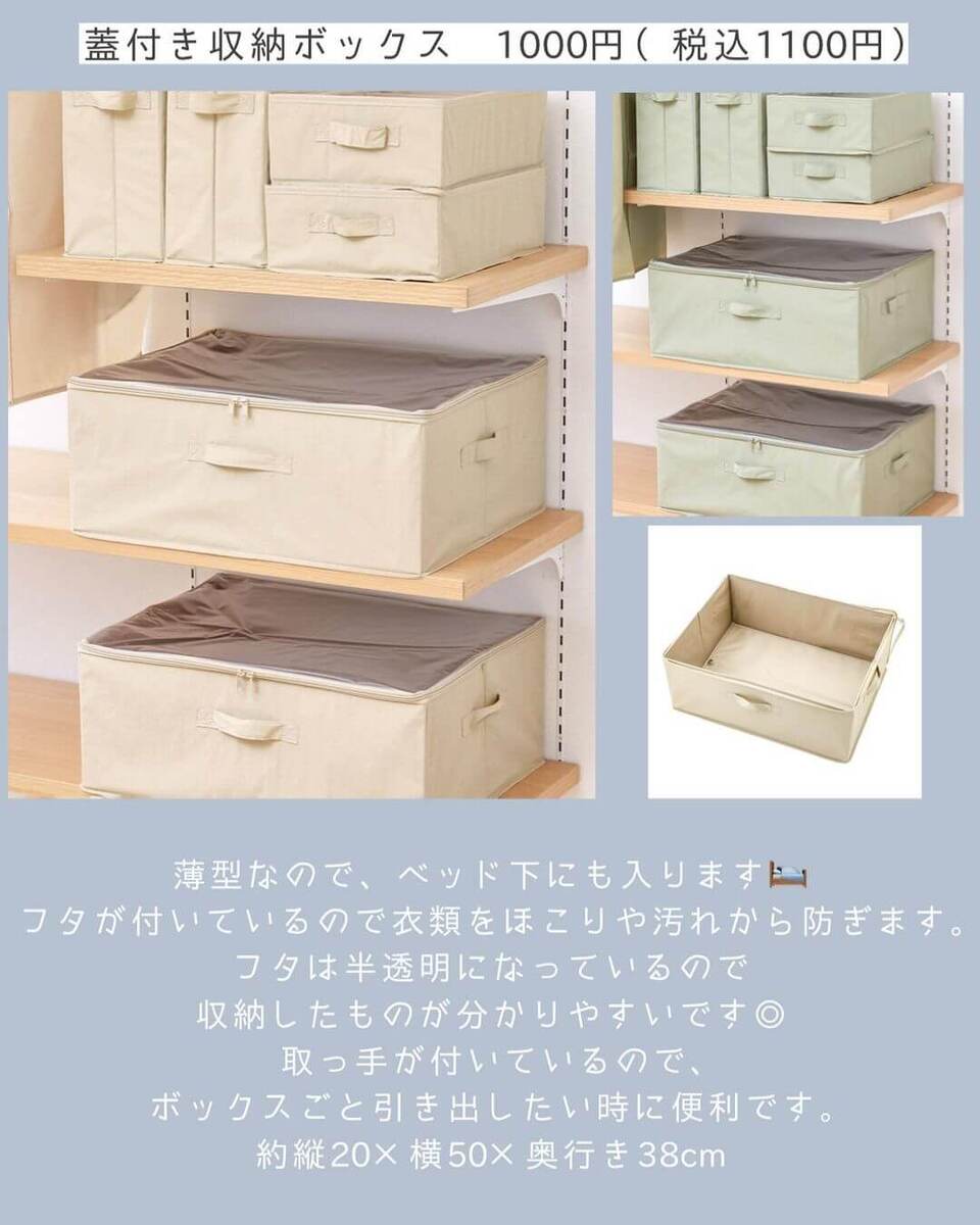 薄型だからベッドの下にも入る、蓋付き収納ボックス(¥1,100)!ジッパー式の蓋で衣類をほこりや汚れから防げます。