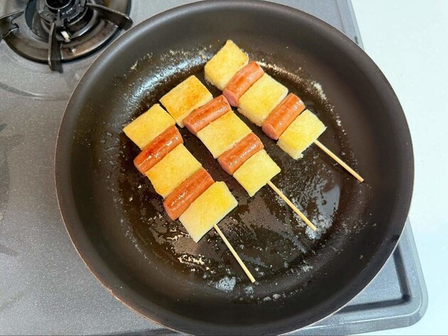 フライパンに多めのバターを入れて溶かし、串を並べて表面を焼きましょう。しっかり焼き目がつくまで焼くと美味しく仕上がります。