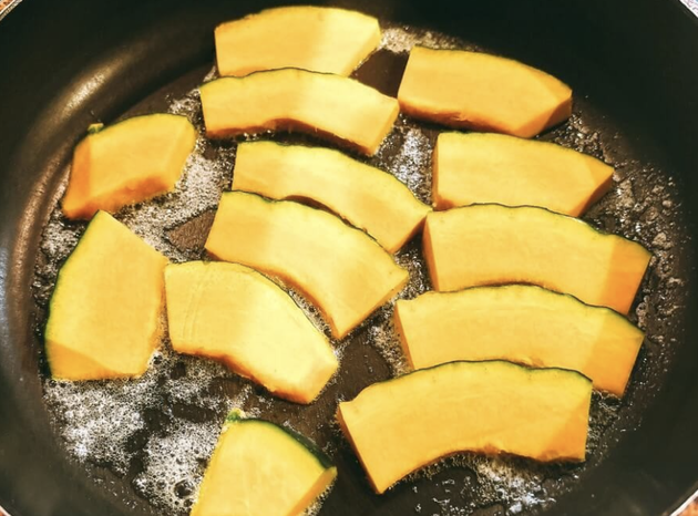 作り方②バターを熱したフライパンにかぼちゃを並べる