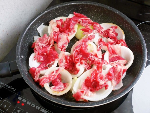 フライパンにフタをして、ごく弱火で約6分蒸し焼きにしましょう。弱火で加熱することで牛肉がやわらかくなり、玉ねぎも甘くなりますよ。