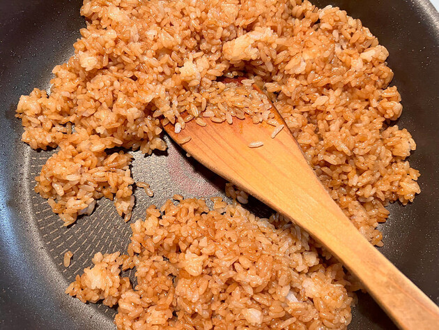 フライパンの中のソースがふつふつとしてきたら、ご飯を加えて混ぜ、炒め合わせましょう。ご飯の白い部分がなくなるようにまんべんなく混ざったら、牛肉を戻し入れます。