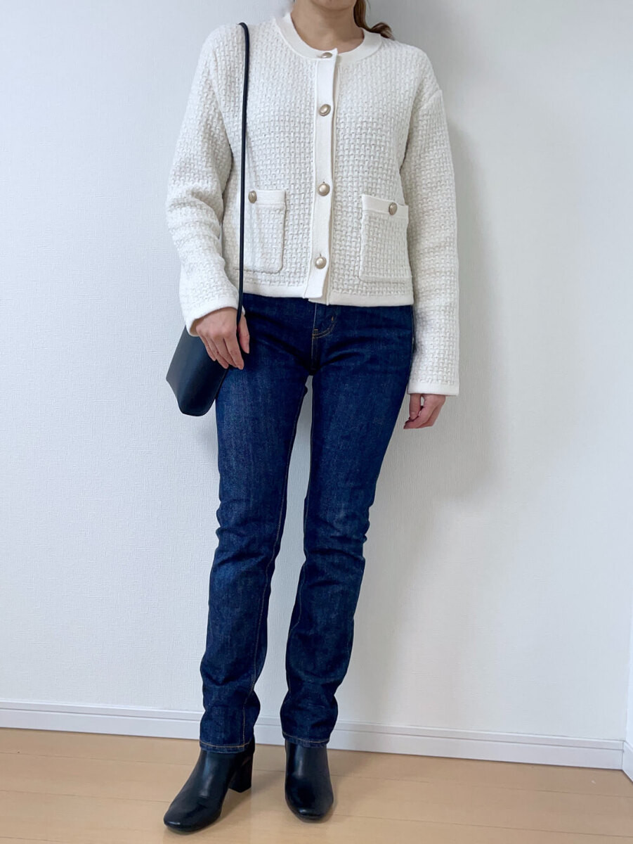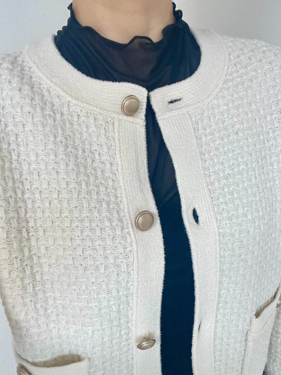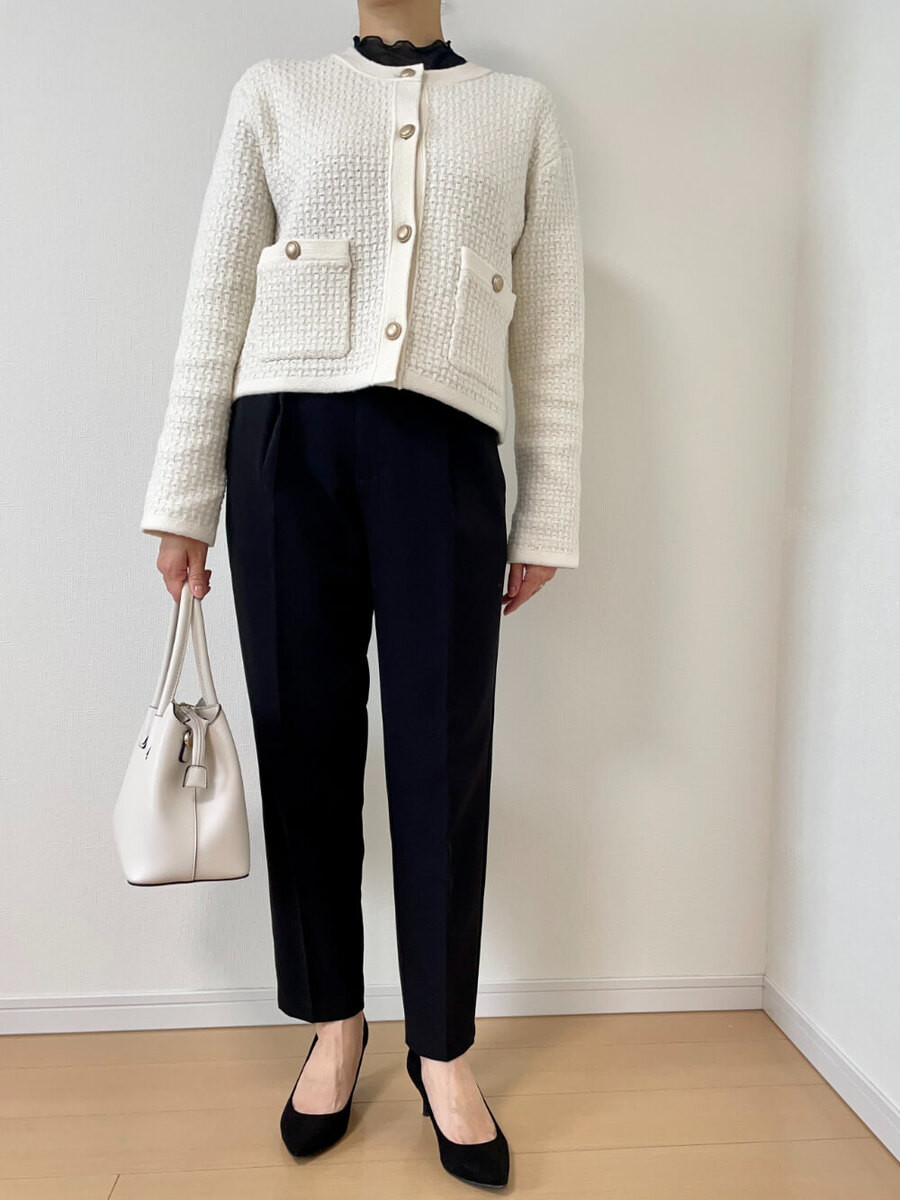 ジャケットですが、ニット素材で優しい雰囲気を演出でき、かっちりしすぎないところがお気に入り。気軽に羽織れて、上品さもプラスしてくれます。