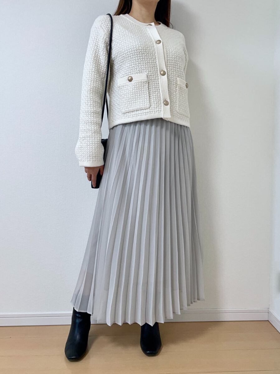 スカートがジャケットと同系色の薄いグレーなので、足元は黒のブーツで引き締めて小物も黒にすることで全体のバランスが整いました!プリーツスカートのシフォン素材が、ジャケットの優しい雰囲気をさらにアップしてくれます。