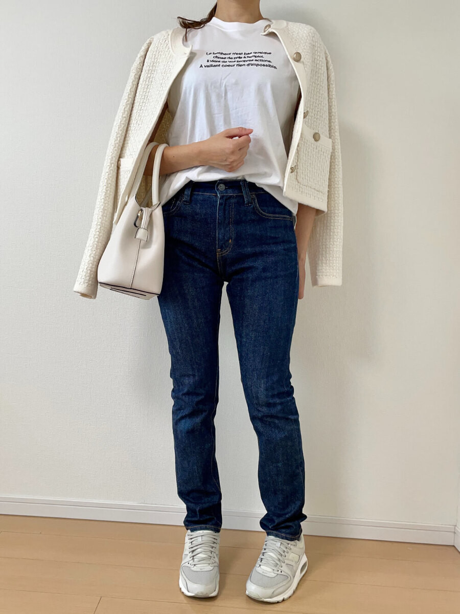 こちらはデニムパンツに合わせたカジュアルコーデです。