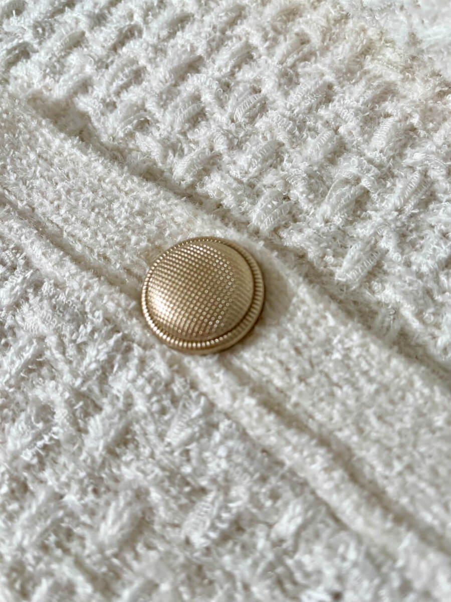 この上品なゴールドボタンがポイントになり、きれいめコーデにもカジュアルダウンにも対応できるので、幅広い着こなしに対応できそうです!